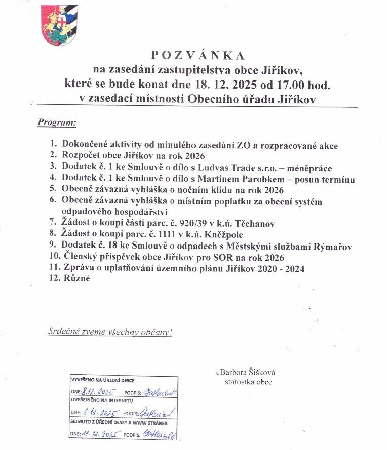 Srdečně zveme všechny občany na letošní sedmé a poslední zasedání zastupitelstva obce, které se koná ve čtvrtek 18.12.2025 od 17:00 hod. v zasedací místnosti Obecního úřadu v Jiříkově.