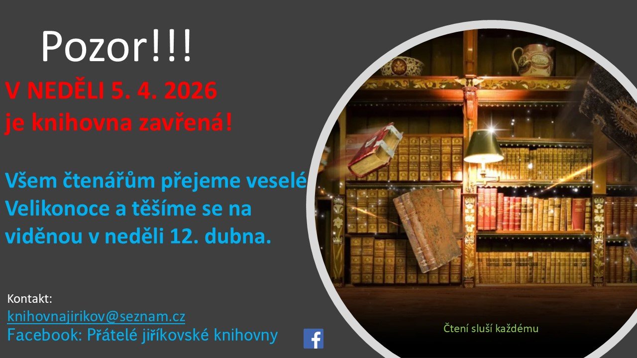 V neděli 5. dubna je místní knihovna v Jiříkově zavřená, abychom si všichni mohli užít svátky s rodinami.