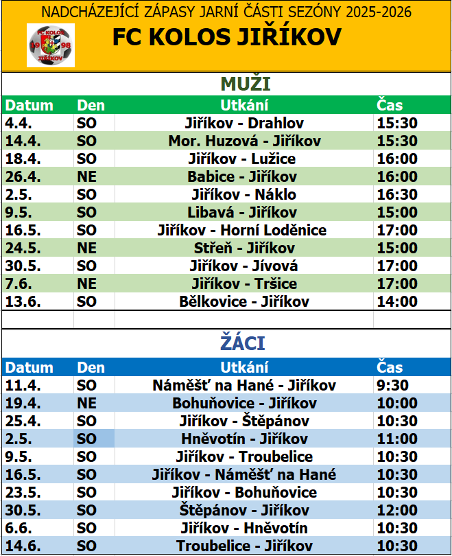Oba týmy FC KOLOS potřebují naši podporu, přijďte jim proto fandit a užít si sportovní atmosféru! Termíny jednotlivých zápasů najdete v přehledné tabulce.